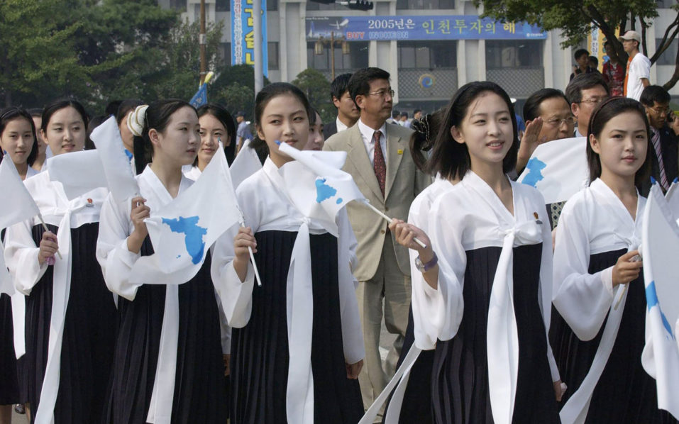 The cheerleaders made their first appearance at the 2002 Asian Games in Busan, hitting the headlines when nearly 300 of them arrived on a ferry dressed in colourful hanboks — traditional Korean dresses — and waving so-called unification flags, a pale blue silhouette of the whole Korean peninsula.