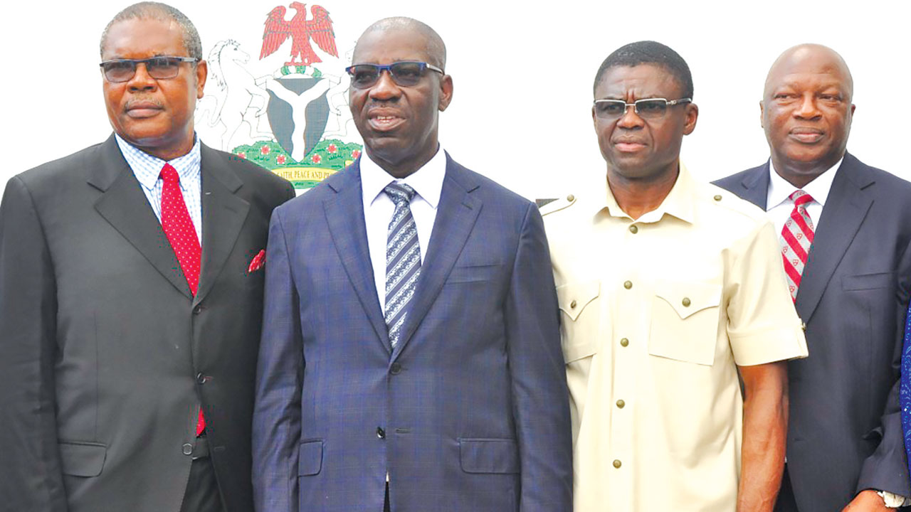 Chairman, Governing Council, Ambrose Alli University, Ekpoma, Lawson Omokhodion (left); Edo State Governor, Godwin Obaseki, Deputy Governor, Philip Shaibu, and Secretary to the State Government, Osarodion Ogie, at the inauguration of eight-man Governing Council for the university, at Government House, Benin City
