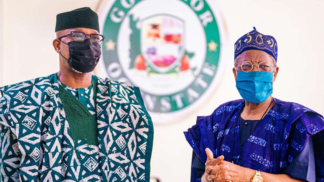Ogun State Governor Dapo Abiodun (left) and Minister of Information, Cultural and Tourism, Lai Mohammed, during the launch of digital marketing of local fabric, adireogun.com, at the June 12 Cultural Centre, Abeokuta… yesterday.