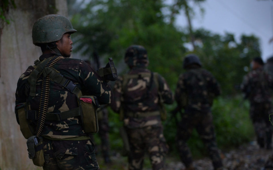 Government troops take position against enemy snipers as they escort rescued workers and trapped residents near the town center where heavy fighting between troops and Muslim militants have been raging in Marawi, in southern island of Mindanao on June 1, 2017, as fighting between government forces and Muslim militants enter its tenth day. Philippine airstrikes aimed at Islamist militants who are holding hostages in a southern city killed 11 soldiers, authorities said as they conceded hundreds of gunmen may have escaped a blockade. / AFP PHOTO / TED ALJIBE