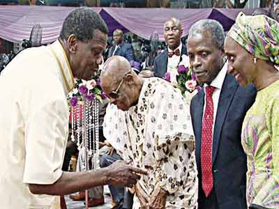 General Overseer (GO), Reedemed Christian Church of God (RCCG), Pastor Enoch Adeboye (left); his deputy, Pastor Joseph Abiona; Vice President, Prof. Yemi Osinbajo and wife, Dolapo; during a special Holy Ghost service at the Redemption Camp in Ogun State.