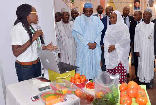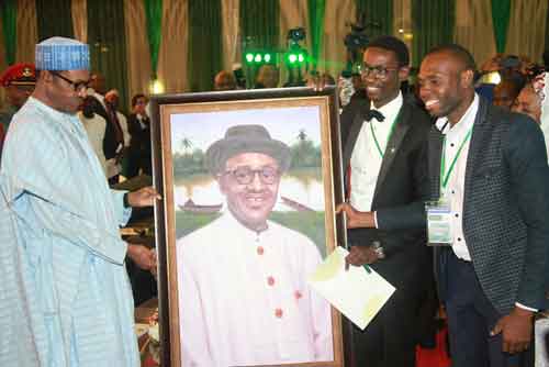 President Muhammadu Buhari in a group photograph with some entrepreneur during events marking the 2015 International Youth Day at the State House Conference Centre, Presidential Villa, Abuja PHOTO:Philip OjisuaPresident Muhammadu Buhari receiving a sovenir from two members of The Port Harcourt Male Ensemble, Prince Iwefa Aganaba and Bob Amunye (r) during events marking the 2015 International Youth Day at the State House Conference Centre, Presidential Villa, Abuja PHOTO: Philip OjisuaPresident Muhammadu Buhari receiving a sovenir from the CEO, The Kemies Supply Company, Mr. George Oni during events marking the 2015 International Youth Day at the State House Conference Centre, Presidential Villa, Abuja PHOTO: Philip OjisuaPermanent Secretary, Ministry of Youth Development, Rabi Jimeta; President Muhammadu Buhari; Head of Service of the Federation, Danladi Kifasi and Owner of O’Bryan Billz Concept, Umeofor Beryan during International Youth Day at the State House Conference Centre, Presidential Villa, Abuja PHOTO: Philip OjisuaFrom left: Permanent Secretary, Ministry of Youth Development, Rabi Jimeta; President Muhammadu Buhari; Head of Service of the Federation, Danladi Kifasi and Founder NextGen, Kofo Durosinmi-Etti during International Youth Day held at the Presidential Villa Abuja PHOTO: Philip Ojisua