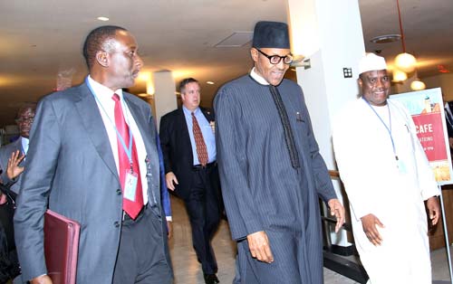 L-R; National Security Adviser, Major General Babagana Monguno, President Muhammadu Buhari, Sokoto State Governor, Rt Hon Aminu Tambuwal, President, Republic of Korea, Her Excellency, Mrs Geun-Hye Park, Nigerian Permanent Representatives, Prof Joy Ogwu and the Permanent Secretary Ministry of foreign Affairs, Ambassador Bulus Z. Lolo after a bilateral meeting during the 70th Session of the UN General Assembly in New York, on September 27 2015.National Security Adviser, Major General Babagana Monguno, President Muhammadu Buhari and Sokoto State Governor, Rt Hon Aminu Tambuwal after a bilateral meeting during the 70th Session of the UN General Assembly in New York, on September 27 2015.