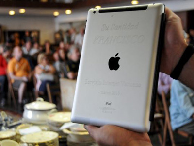 The device carries the inscription “His Holiness Francisco. Servizio Internet Vatican, March 2013,” and has a certificate signed by the Pope’s personal secretary, Fabian Pedacchio Leaniz.