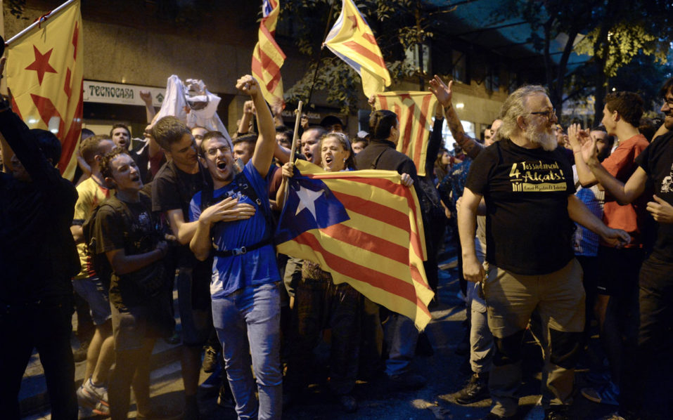 Thousands took to the streets of Barcelona as Spanish police detained 13 Catalan government officials in a crackdown ahead of an independence referendum which Madrid says is illegal. With tensions mounting, separatist organisations called for more people to protest as leaders in the northeastern region pressed ahead with preparations for the October 1 vote despite Madrid’s ban and a court ruling deeming it unconstitutional. / AFP PHOTO / Josep LAGO