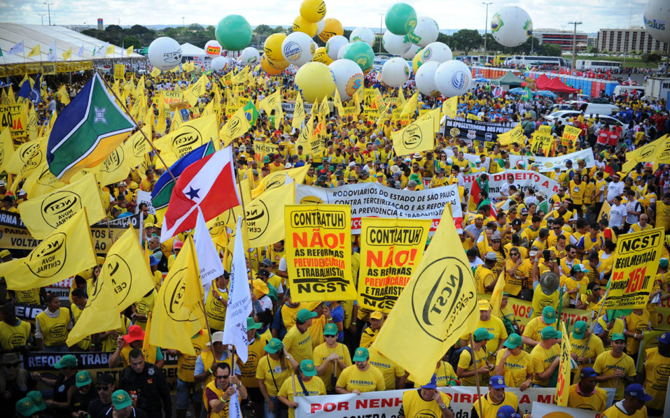 Organized by leftist groups and trade unions, the protesters poured into the center of Brazil’s capital.