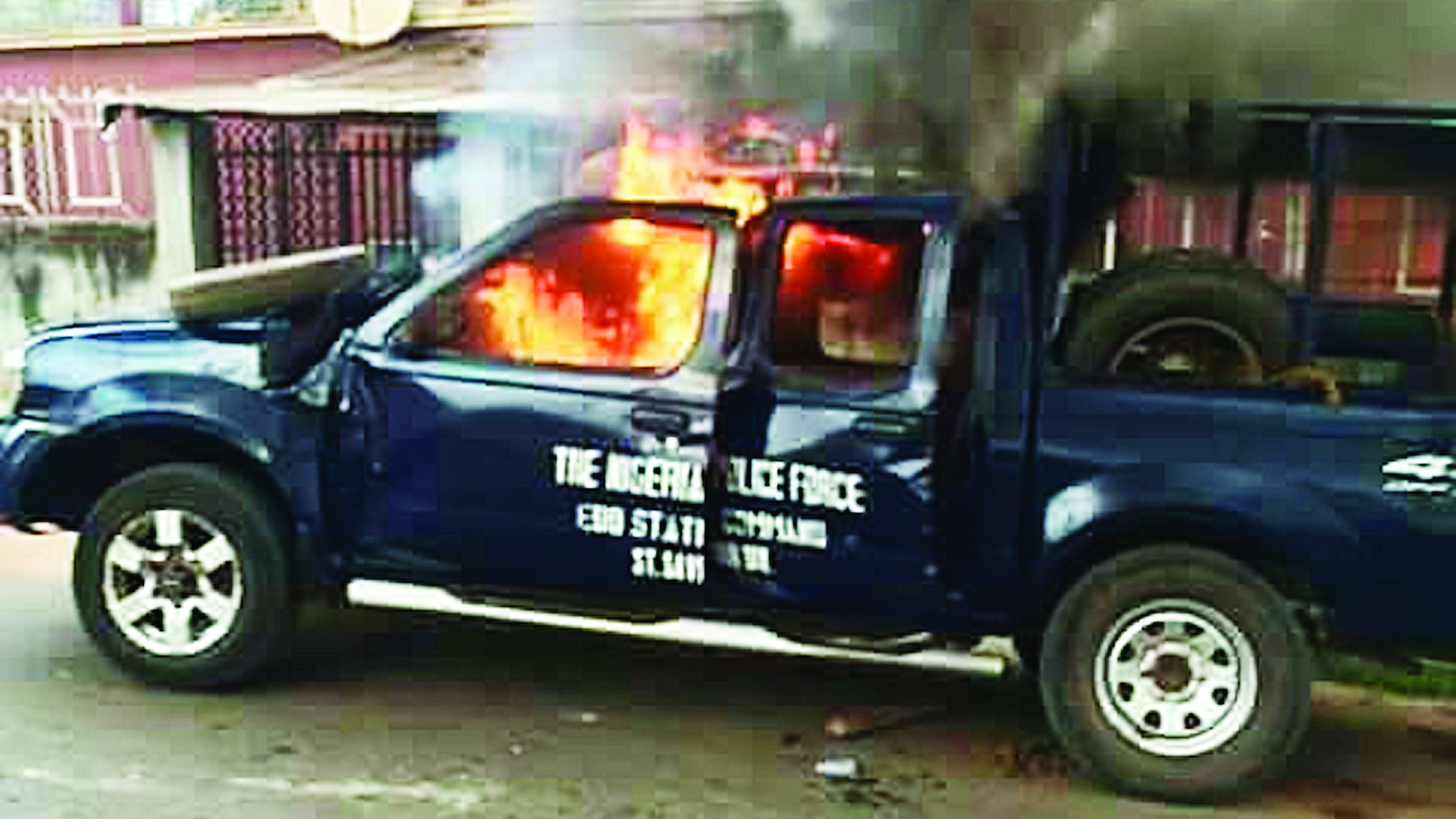 Many parts of Benin City were locked down yesterday with four police patrol vehicles and a truck belonging to the state government burnt by an angry mob after a commercial cab driver, simply identified as John, was crushed to death by a truck while having an altercation with policemen at a checkpoint.