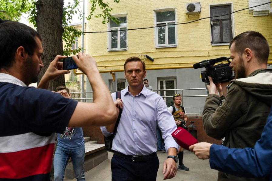 Russian opposition leader Alexei Navalny, who was detained during May 5 anti-Putin rally, arrives at the courthouse in Moscow on May 15, 2018. Russian opposition leader Alexei Navalny on May 15, 2018 appeared in court over nationwide demonstrations on May 5 that saw hundreds arrested as they protested Vladimir Putin’s inauguration for a fourth term. Navalny faces charges of organising an illegal protest and of disobeying police orders, which could see him jailed for up to two months or forced to pay a fine. / AFP PHOTO / Kirill KUDRYAVTSEV