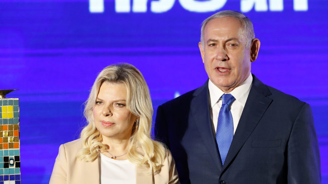 Israeli Prime Minister Benjamin Netanyahu (R) stands by his wife Sara before lighting a stylised-menorah during the start of Hanukkah, the Jewish festival of lights, in Ramat Gan in the suburbs of the Mediterranean coastal city of Tel Aviv on December 2, 2018. - Israeli police on December 2 recommended indicting Prime Minister Benjamin Netanyahu and his wife Sara for bribery and other offences, the third such move against the premier in recent months. Netanyahu immediately rejected the accusations, but the three cases against him have led to speculation that they could eventually force the long-serving prime minister to step down. (Photo by Jack GUEZ / AFP)
