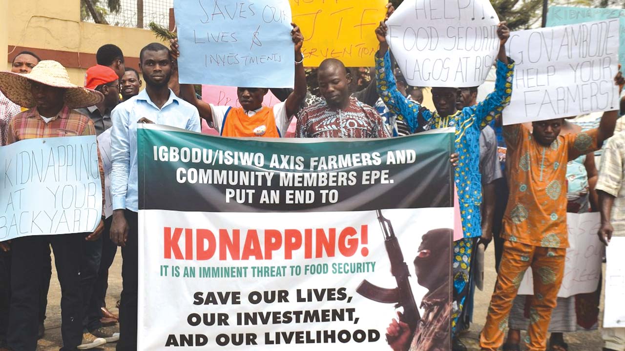 Hundreds of Epe farmers and community leaders yesterday stormed the office of the Lagos State governor, Mr. Akinwunmi Ambode, to protest against the continued abduction of their members by kidnappers.They claimed that nearly 50 farmers have so far been kidnapped at different times with millions of naira paid as ransom before the victims were freed.