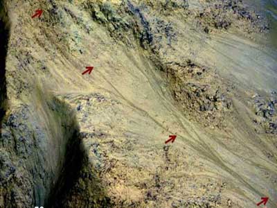 Scientists announced Monday they had found tracks formed by hydrated salt crystals — essentially super-salty brine — running down steep slopes on the surface of the Red Planet.