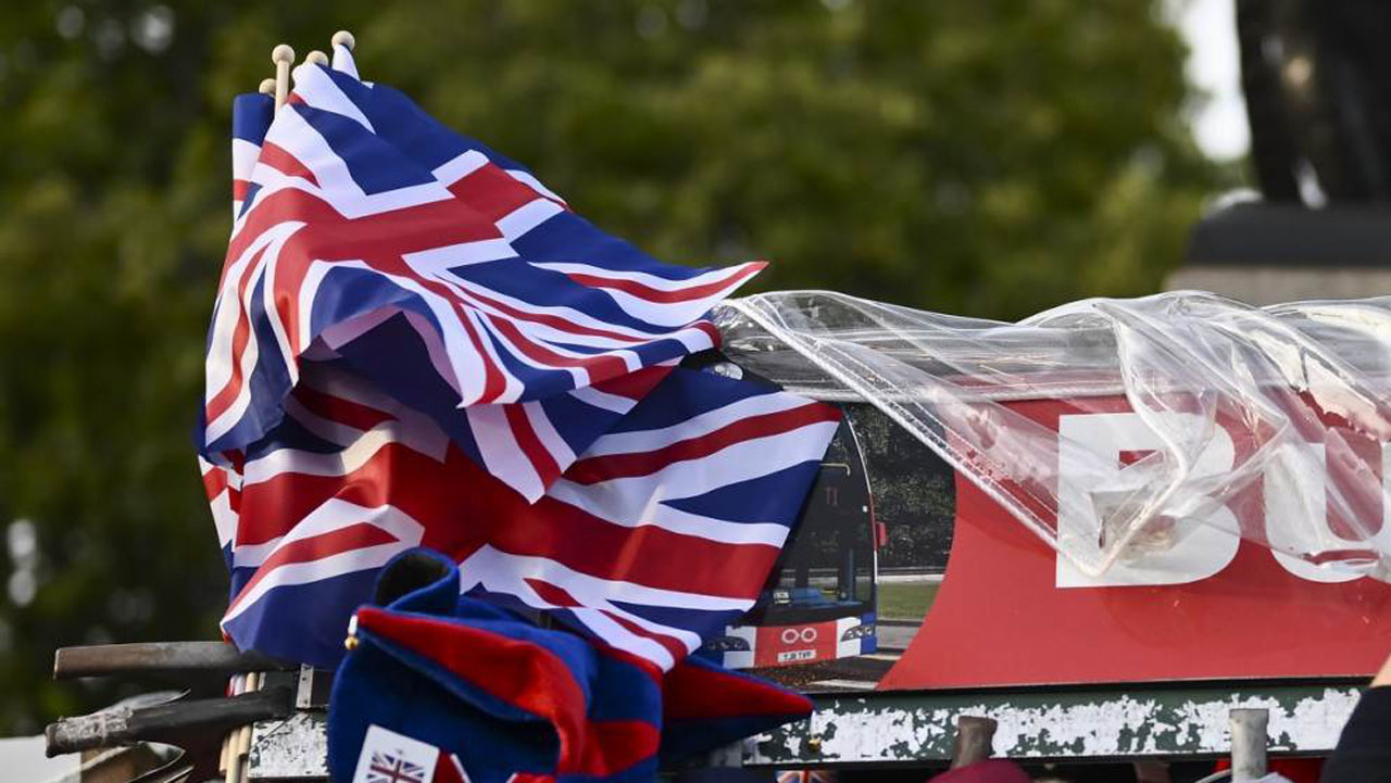 A man reaches for a flag with the portrait of Britain’s Queen Elizabeth II on at a vendor’s stall in London on September 11, 2022. – Queen Elizabeth II’s coffin will travel by road through Scottish towns and villages on Sunday as it begins its final journey from her beloved Scottish retreat of Balmoral. The Queen, who died on September 8, will be taken to the Palace of Holyroodhouse before lying at rest in St Giles’ Cathedral, before travelling onwards to London for her funeral. (Photo by Marco BERTORELLO / AFP)