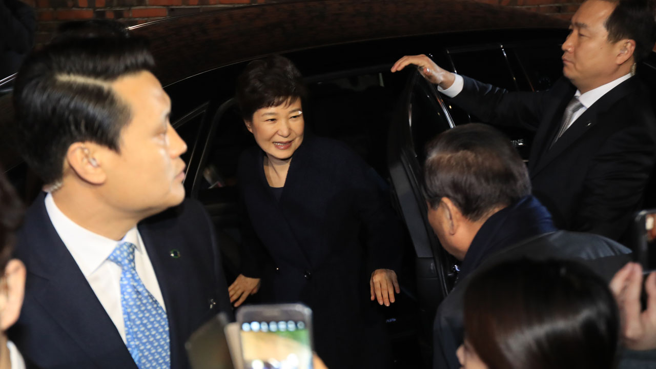 South Korea's impeached ex-president Park Geun-Hye (C) arrives at her private residence in Seoul on March 12, 2017. South Korea's impeached ex-president Park Geun-Hye left the presidential Blue House on March 12, two days after the Constitutional Court's verdict removing her from office over a massive corruption scandal. / AFP PHOTO / YONHAP / STR / - South Korea OUT /
