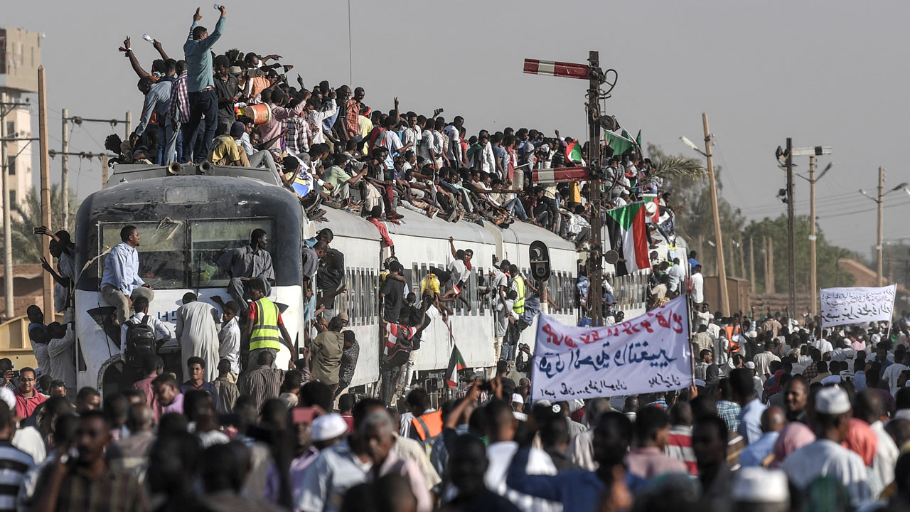 (FILES) In this file photo taken on April 23, 2019 protesters from the city of Atbara, sitting atop a train, cheer upon arriving at the Bahari station in Sudan's capital Khartoum. - Sudanese protesters are gearing up for mass anti-coup rallies on April 6 to mark the anniversaries of historic events that toppled Sudanese autocrats, most recently president Omar al-Bashir three years ago. (Photo by OZAN KOSE / AFP)