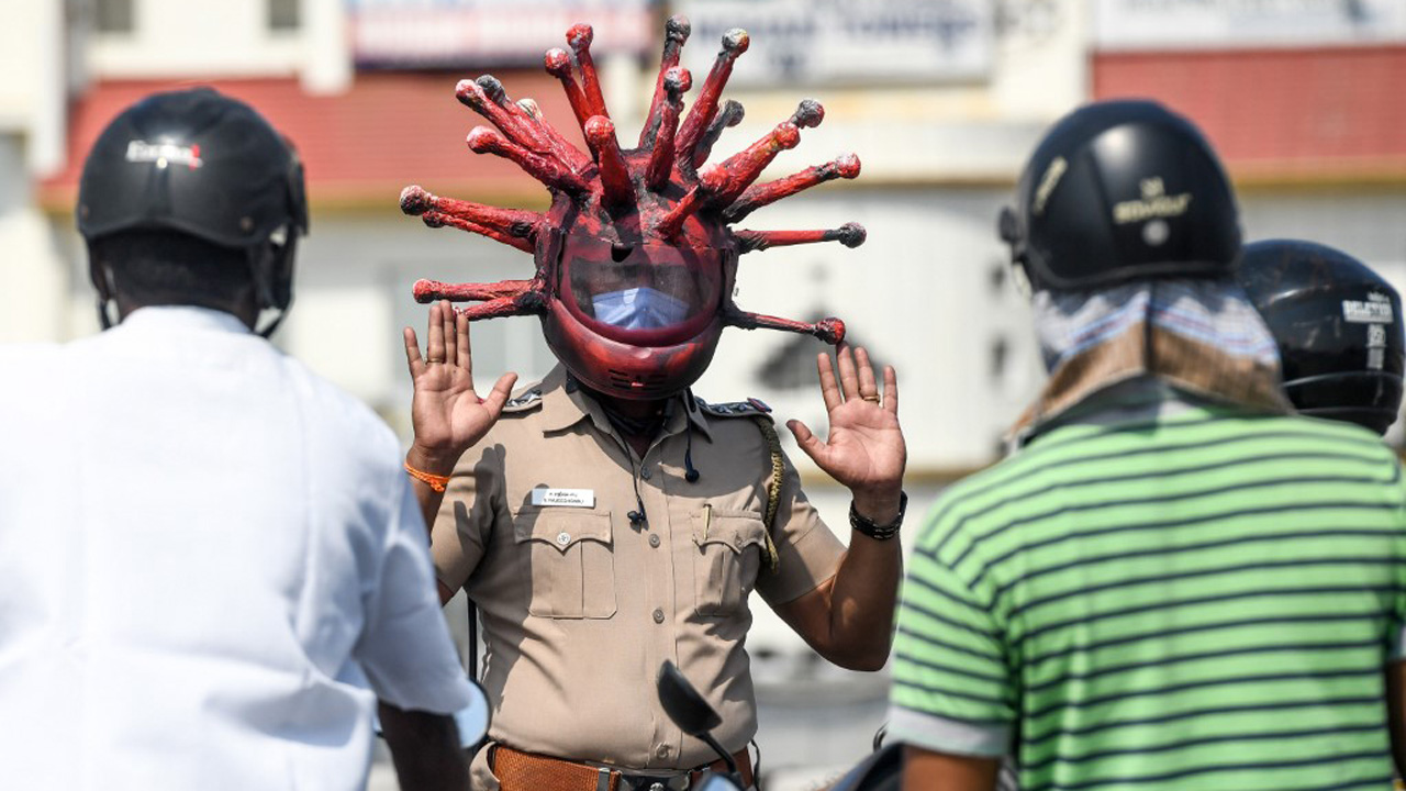 Police inspector Rajesh Babu (C) wearing a coronavirus-themed helmet speaks to motorists at a checkpoint during a government-imposed nationwide lockdown as a preventive measure against the COVID-19 coronavirus in Chennai on March 28, 2020. Arun SANKAR / AFP