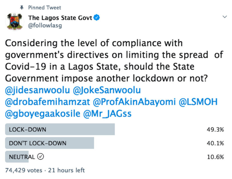 The State government, through three of its social media platforms, namely; Twitter: @followlasg, Facebook: Lagos State Government and Instagram: @lagosstategovt, on Tuesday, May 12, instituted a poll to determine the perspective of members of the public on the possibility of another lockdown of Lagos.