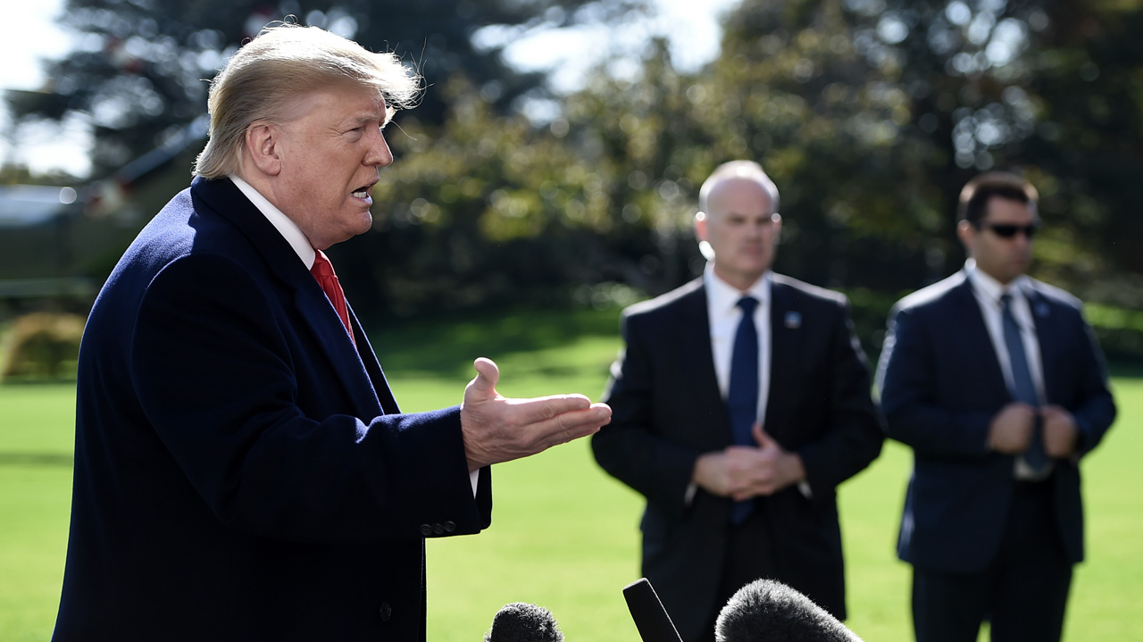 US President Donald Trump talks to the media on the South Lawn upon his return to the White House by Marine One, in Washington, DC, November 3, 2019, after returning from a trip to New York. (Photo by Olivier Douliery / AFP)