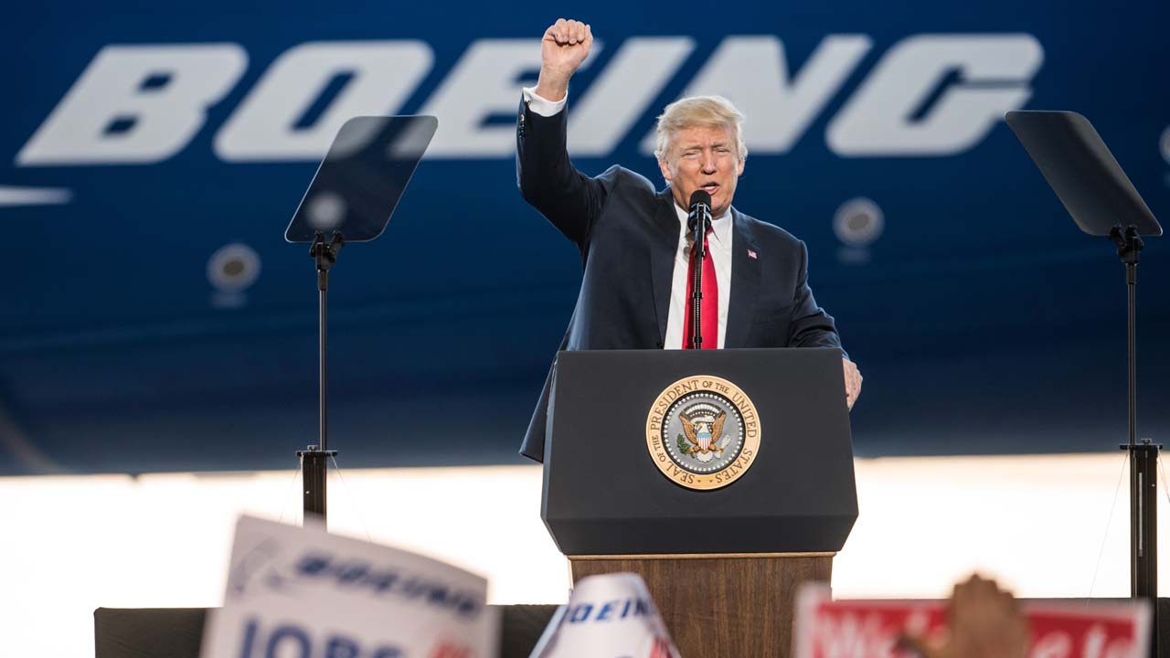 NORTH CHARLESTON, SC - FEBRUARY 17: U.S. President Donald Trump addresses a crowd during the debut event for the Dreamliner 787-10 at Boeing's South Carolina facilities on February 17, 2017 in North Charleston, South Carolina. The airplane begins flight testing later this year and will be delivered to airline customers starting in 2018. Sean Rayford/Getty Images/AFP Sean Rayford / GETTY IMAGES NORTH AMERICA / AFP