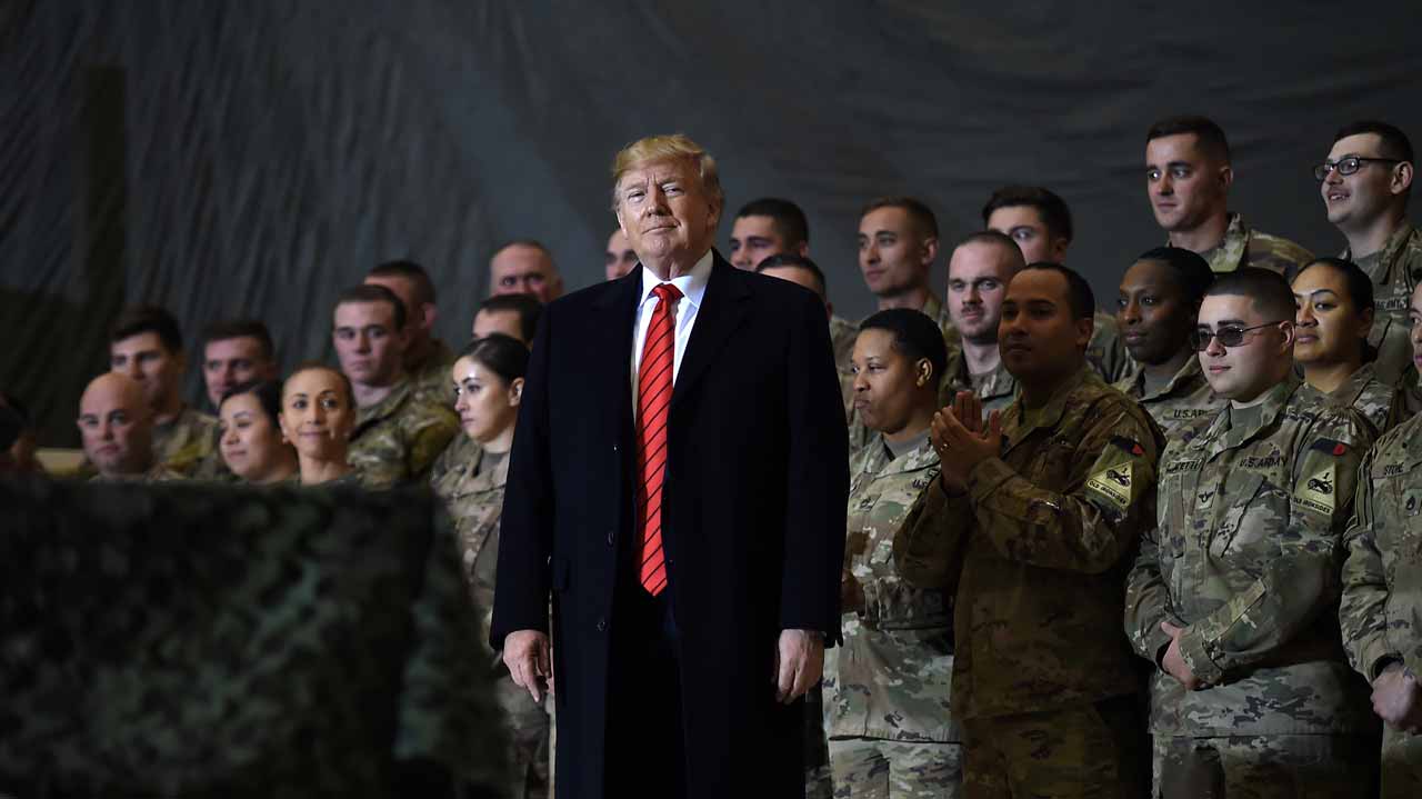 US President Donald Trump speaks to the troops during a surprise Thanksgiving day visit at Bagram Air Field, on November 28, 2019 in Afghanistan. Olivier Douliery / AFP