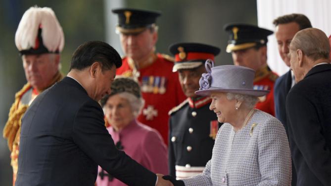 Xi and his wife Peng Liyuan were greeted by the queen, her husband Prince Philip and dignitaries including Prime Minister David Cameron at Horse Guards parade ground near Buckingham Palace.