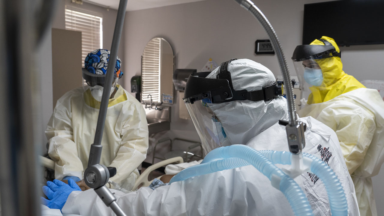 Members of the medical staff treat a patient in the COVID-19 intensive care unit at the United Memorial Medical Center on July 2, 2020 in Houston, Texas. COVID-19 cases and hospitalizations have spiked since Texas reopened, pushing intensive-care wards to full capacity and sparking concerns about a surge in fatalities as the virus spreads. Go Nakamura/Getty Images/AFP