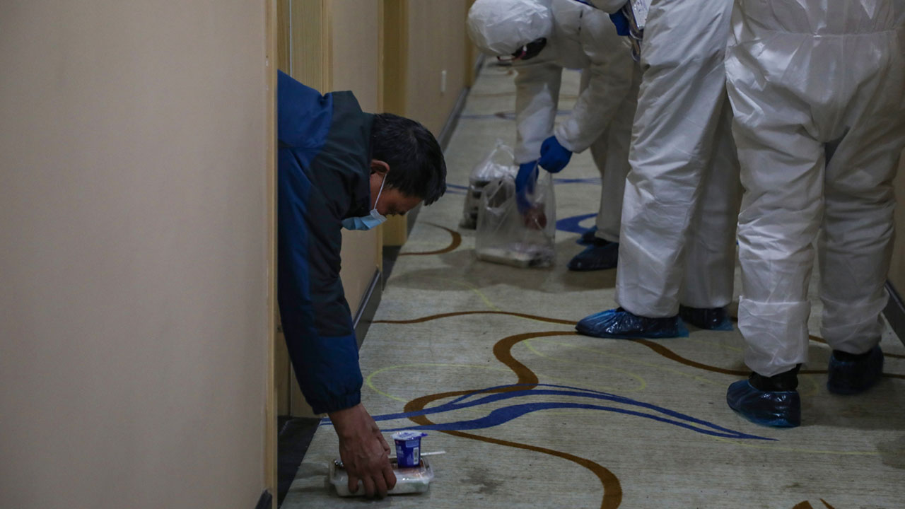 This photo taken on February 3, 2020 shows medical staff members leaving lunch boxes on the ground for patients to avoid cross infection at a quarantine zone in Wuhan, the epicentre of the new coronavirus outbreak, in China’s central Hubei province. – The number of total infections in China’s coronavirus outbreak has passed 20,400 nationwide with 3,235 new cases confirmed, the National Health Commission said on February 4. (Photo by STR / AFP) / China OUT