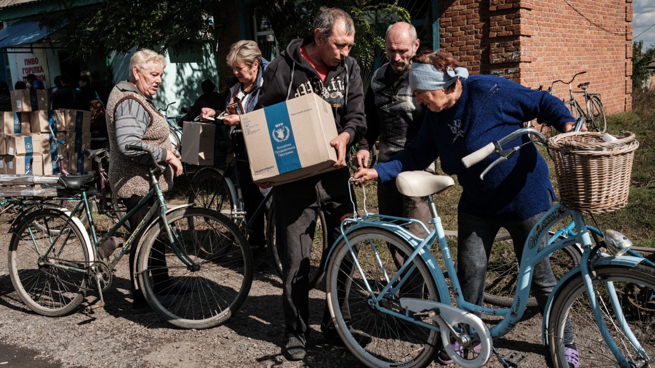 “It’s been terrible, terrible. I can’t even describe it,” said 75-year-old Galina Mykhailivna, hunkered down while waiting for food rations in front of a village cultural centre with a gaping shell hole in the facade.