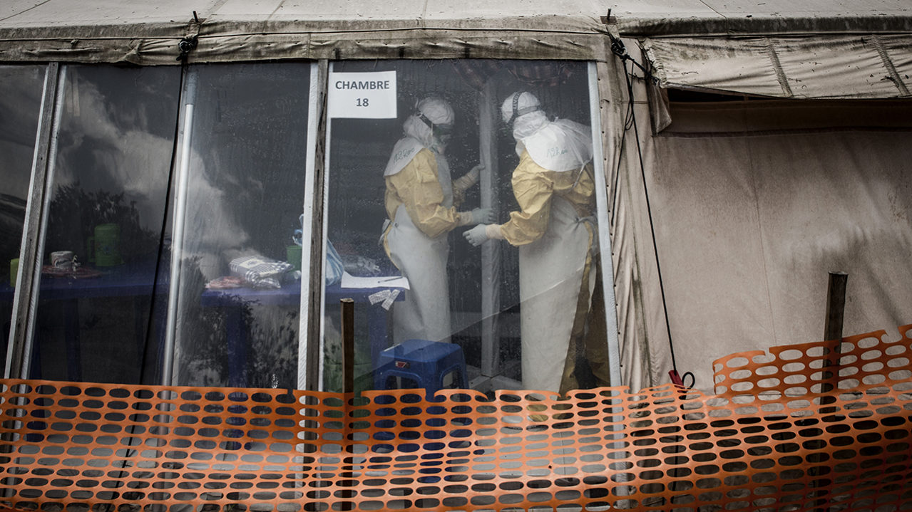(FILES) In this file photo taken on March 9, 2019 health workers are seen inside the ‘red zone’ of an Ebola treatment centre (Photo by JOHN WESSELS / AFP)