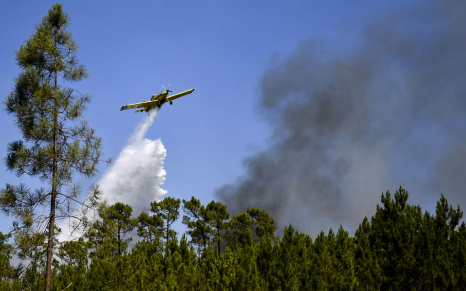 A firefighter plane pours water on a wildfire in Sardoal on August 17, 2017. / AFP PHOTO / PATRICIA DE MELO MOREIRA / “The erroneous mention[s] appearing in the metadata of this photo by PATRICIA DE MELO MOREIRA has been modified in AFP systems in the following manner: [Sardoal] instead of [Macao]. Please immediately remove the erroneous mention[s] from all your online services and delete it (them) from your servers. If you have been authorized by AFP to distribute it (them) to third parties, please ensure that the same actions are carried out by them. Failure to promptly comply with these instructions will entail liability on your part for any continued or post notification usage. Therefore we thank you very much for all your attention and prompt action. We are sorry for the inconvenience this notification may cause and remain at your disposal for any further information you may require.”