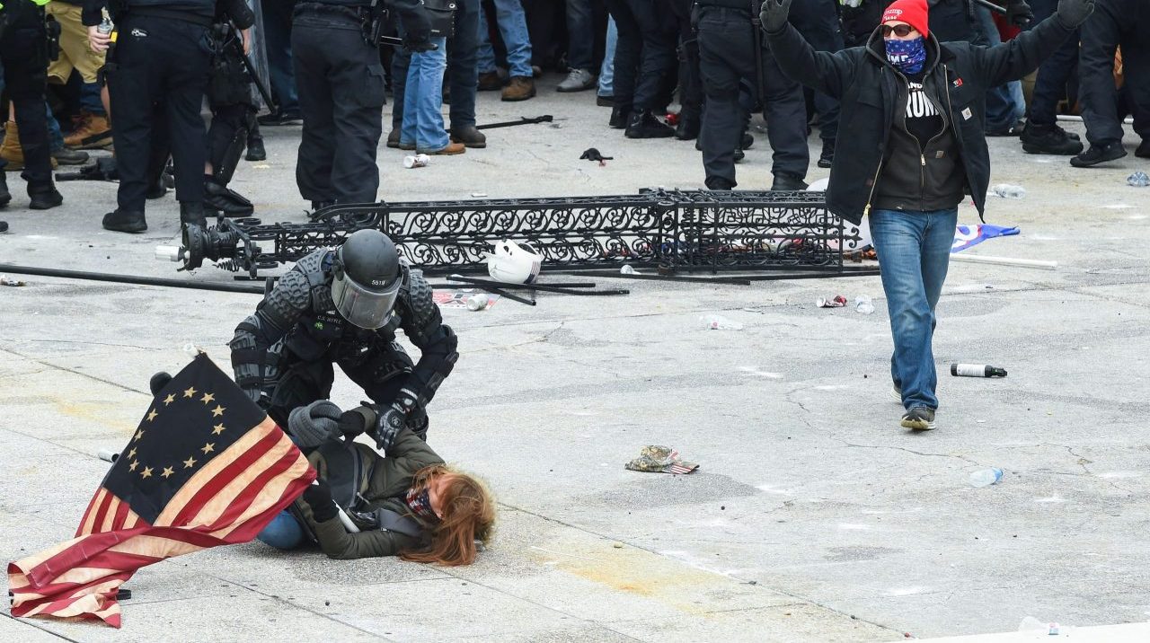 Trump supporters clash with police and security forces as they storm the US Capitol in Washington, DC on January 6, 2021. - Demonstrators breeched security and entered the Capitol as Congress debated the a 2020 presidential election Electoral Vote Certification. (Photo by ROBERTO SCHMIDT / AFP)