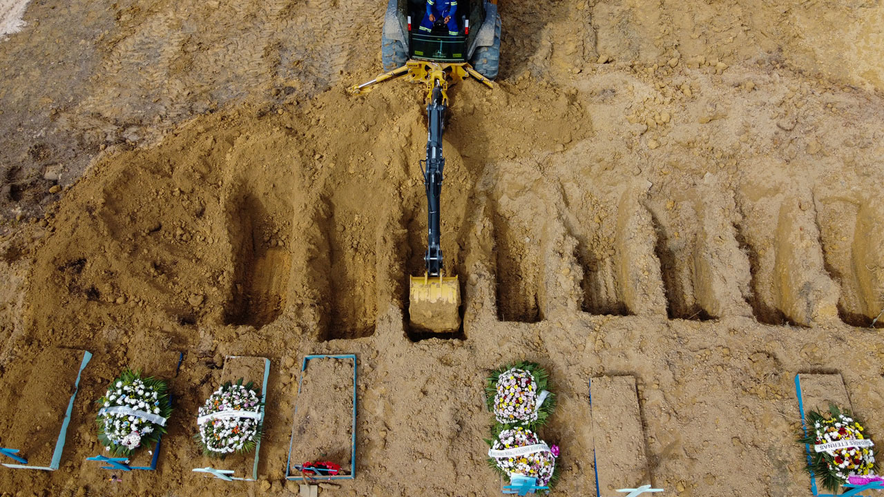 (FILES) This file photo taken on January 08, 2021 shows an aerial view of a tractor digging graves in a new area of the Nossa Senhora Aparecida cemetery reserved for COVID-19 victims, in Manaus, Brazil. – Brazil registers record of 1,641 Covid-19 deaths in 24 hours, on March 2, 2021, according to official sources. (Photo by Michael DANTAS / AFP)