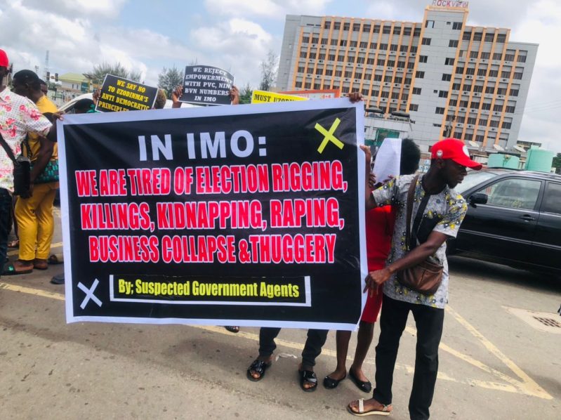 Some youths in Imo State 500 have protested against the alleged plot by Governor Hope Uzodinma and agents to compromise the forthcoming governorship election in the state.