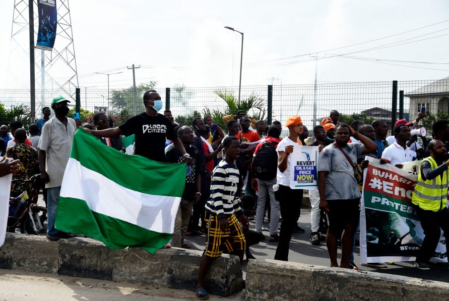 A protester holds his national flag during a demonstration at Ojota in Lagos on June 12, 2021, as Nigerian activists called for nationwide protests over what they criticise as bad governance and insecurity, as well as the recent ban of US social media platform Twitter by the government of President Muhammadu Buhari. – Hundreds of protesters gathered on June 12, 2021 in Lagos, a sprawling megapolis of over 20 million people, and police fired tear gas to disperse the crowd. (Photo by PIUS UTOMI EKPEI / AFP)