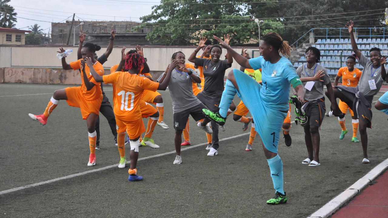 Cote d’Ivoire celebrating after beating Nigeria to the Tokyo 2020 Olympics women football ticket at Agege Stadium, Lagos…yesterday.